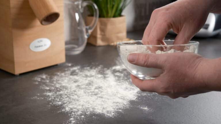 Das Mehl/Salz-Gemisch kommt jetzt auf die Flüssigkeit in die große Schüssel.
