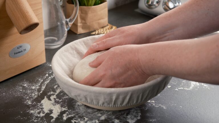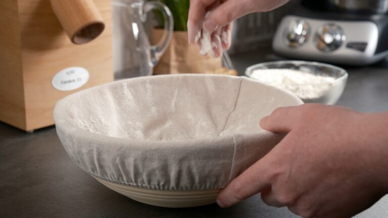 Du bereitest jetzt deinen Gärkorb oder alternativ dein Küchentuch vor. Dazu mehlst du es ordentlich ein und im Fall des Küchentuchs legst du dieses in eine Schüssel. Dort kommt gleich unser Teig rein.