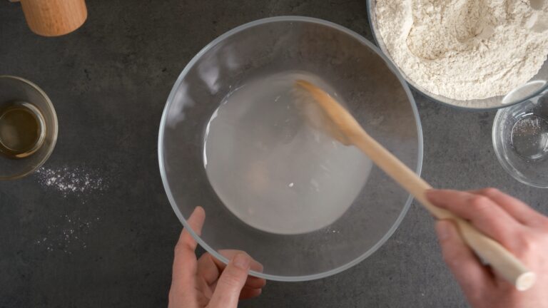 Du gibst die frische Hefe in das Wasser und wartest etwa 5 Minuten, bis sich die Hefe aufgelöst hat. Damit sich die Hefe dann vollständig im Wasser verteilt, verrührst du sie anschließend und gibst zum Schluss den Essig hinzu.