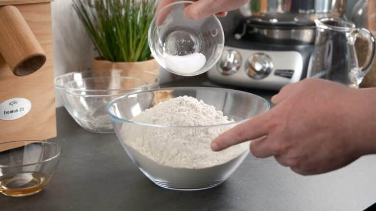 Damit sich das Salz von Beginn an gut im Teig verteilen kann, wird es jetzt über das Mehl (Weizen & Roggen) gegeben und ordentlich durchgerührt. So vermeiden wir, dass sich das Salz nirgendwo konzentriert.