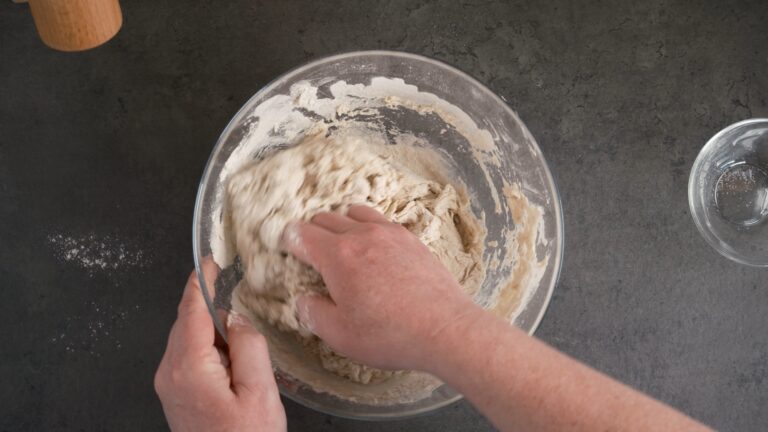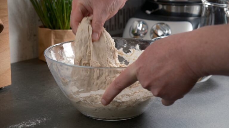 Nach der Stunde dehnst und faltest du den Teig mehrmals. Dazu greifst du am Rand in die Schüssel und ziehst den Teig einmal lang, klappst ihn dann wieder in die Mitte über sich selbst und wiederholst den Vorgang dann einmal im Kreis.