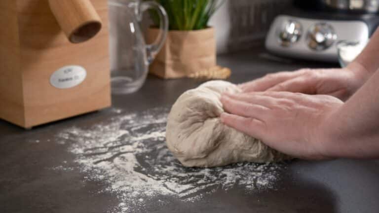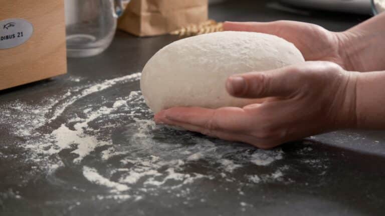 Oben bildet sich dadurch der Schluss, das ist die Stelle, wo der Teig zusammengedrückt wird. Du drehst den Teig nun um, sodass der Schluss auf der Arbeitsplatte ist. Dann drückst du mit den Handkanten den Schluss leicht zusammen. So bildest sich Spannung im Teig.